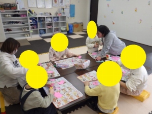 ハサミに挑戦!桜の花びらに切り、模様を描いたり、糊でカラフルな色紙を貼ったりみんなが集中して制作に取り組みました。壁面に貼る作業も協力して貼れました!
