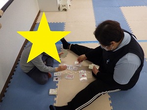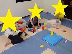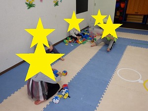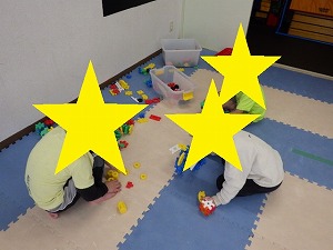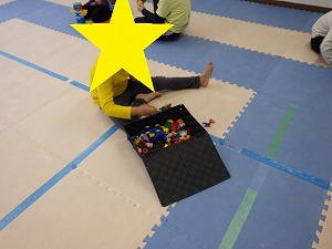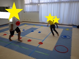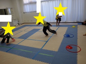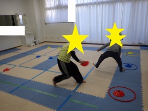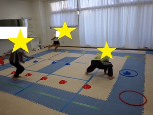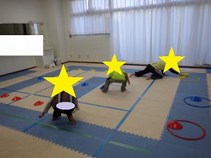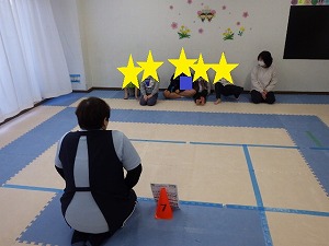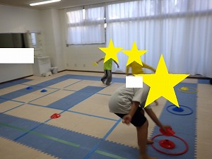 みんな体を素早く動かしてカップを拾いながら、上手に同じ色のフープの中に重ねて置いていく事が出来ました(^^)/