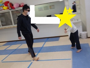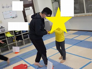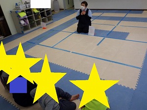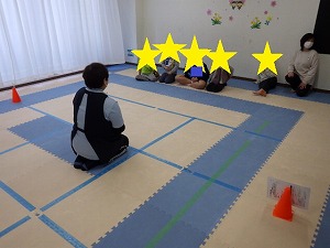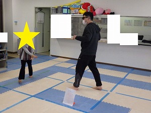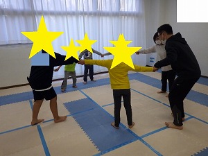 みんなで手を繋いで丸くなったら、先生の指示通りに「前」「後ろ」「右」「左」と手を繋いだままジャンプしていきます!!