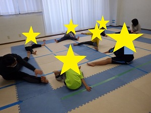 怪我をしないように柔軟体操で体をよくほぐしましょう(^^)/