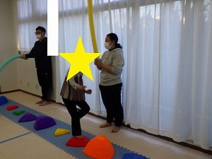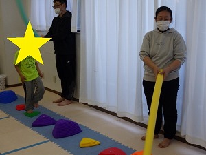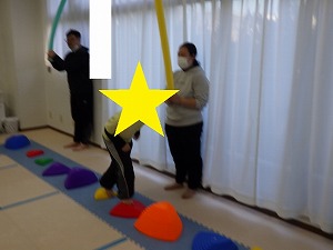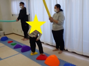 様々な大きさや形のストーンの上を歩きながら、途中に先生たちが動かしているスポンジ棒の遮断機をタイミングよく避けてゴールを目指します!!