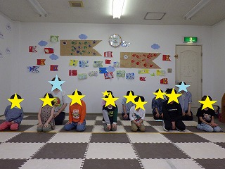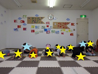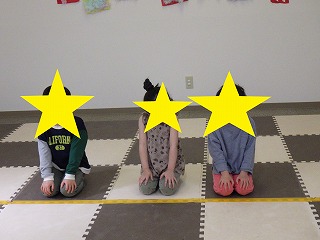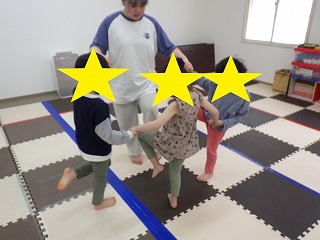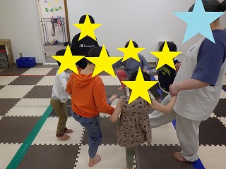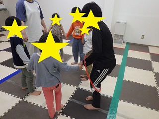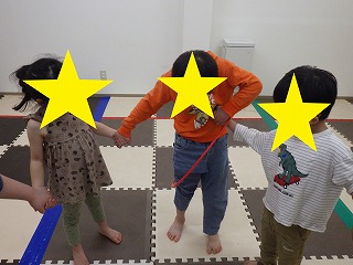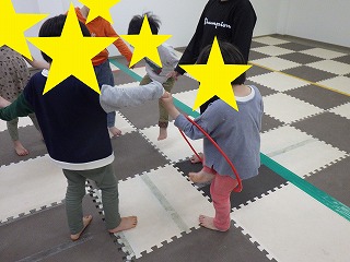 かかしはみんなで手を繋いで片足を上げます。お友だちと助け合いながら頑張りました!