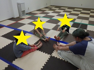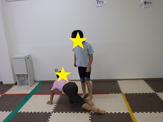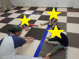 みんなで手を繋いで助け合いながらかかしの姿勢をキープします。