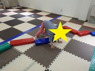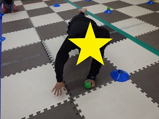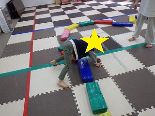 平均台をくねくね道に並べます!クマさんの形になったら横歩きでくねくね道を進んでいきます✨手がクロスにならないようにゆっくり進んでいきます!