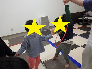 お友達と手を繋ぎ、順番にフープを通して回していきます。