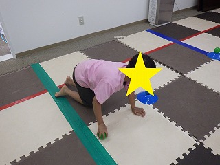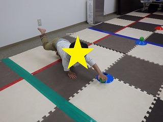 「スタート」の合図でコーンを目指して腕だけの力で進んでいきます!