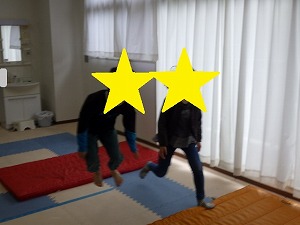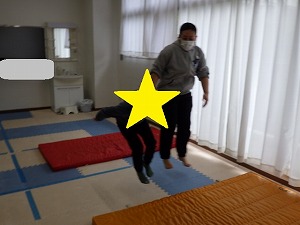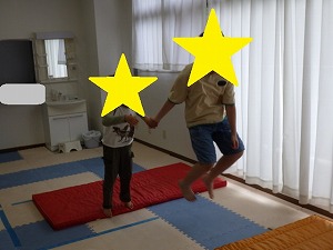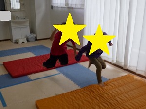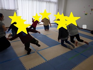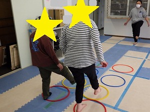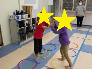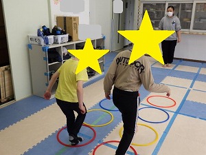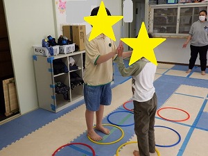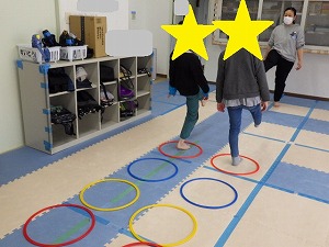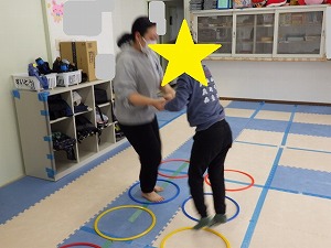フープの中を歩いて進んだり、友だちと向かい合わせでハイタッチをしてからジャンプで進みました!!