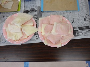 2チームにわかれて春巻きの皮にクルクル包み込みます。