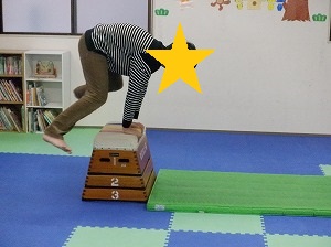 両腕でしっかりと体重を支えて飛んでみよう!開脚飛びが出来たら、前転してポーズ!!4段や5段にも挑戦しました。