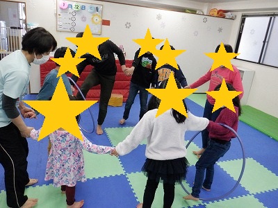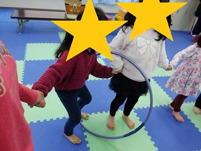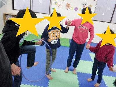 手を繋いだまま、体を上手に使ってフープを通していきましょう(^O^)/