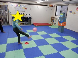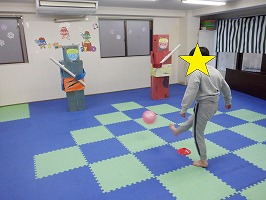ボールを見ながら鬼の胸あたりを目がけてキック!!