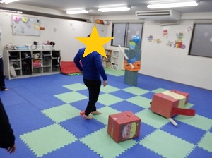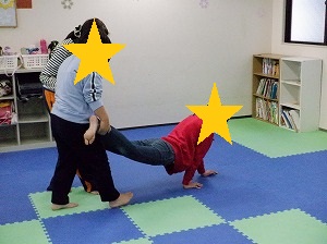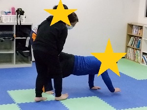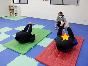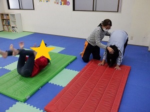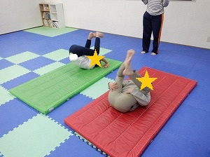 ペアになって手押し車をしましょう!手の平を床にしっかりつけながら進もうね。最後まで行けたら、マットで前転です。お友達とタイミングを合わせて前転出来たかな?
