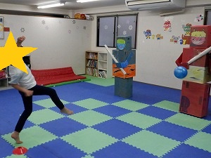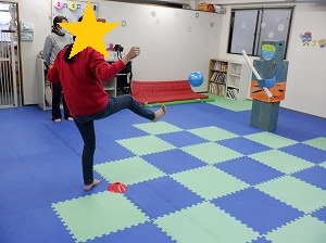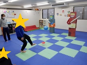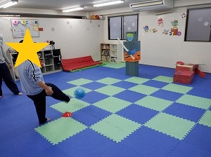 明日が節分なので、今日は鬼退治の前夜祭です!赤鬼さんと青鬼さん目掛けてボールをキックしよう!!