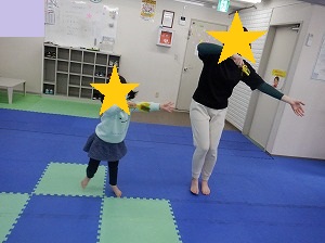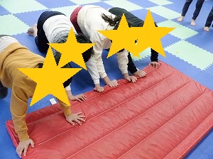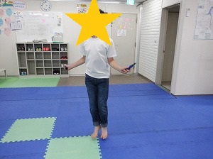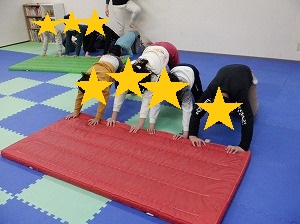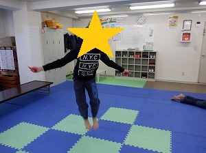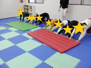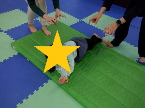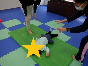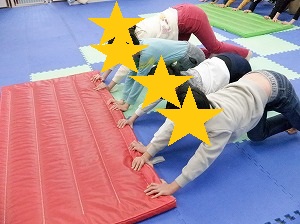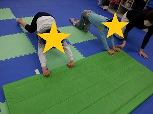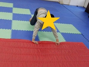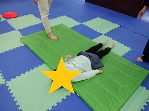 鬼が言った場所を隠して、マットの上をコロコロ寝返りをしながら、鬼に捕まらないように転がります。