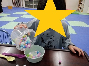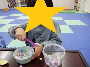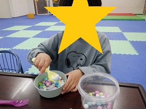 ピョ~ン!ピョ~ン!ピョ~ン!!ピーナッツバランスボールに乗ってご機嫌です。集中してボール掬いをし、何度も繰り返し楽しんでいました。フォークを持ってとても嬉しそうでした♡