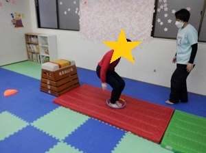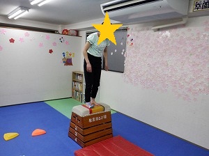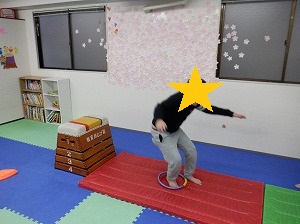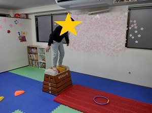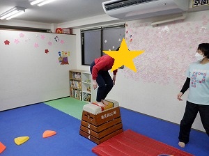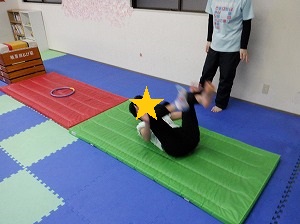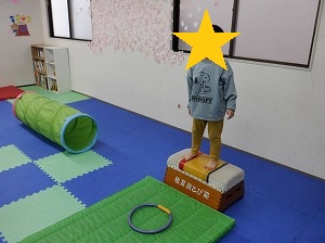 落ちないようにストーンの上を渡ったら、跳び箱の上からフープにジャンプ!!最後は、くるりとマットで前転出来るかな?