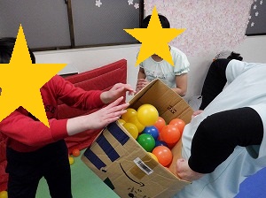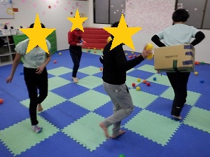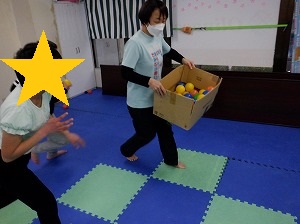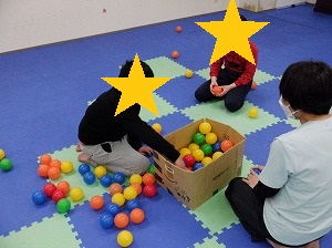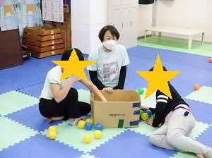 みんな頑張ったので、最後に玉入れを楽しみました。あちこち移動する箱を追いかけボールを拾って投げて、時には転がってみたりするお友だちの姿も。2回戦して、1回目は77個、2回目は94個入りました。何個入ったか数えるお手伝いもしてくれました。ボールのお片付け素早く出来たね♡