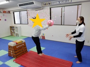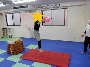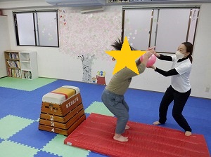 ワニさん歩きで進んだら、跳び箱の上に立ってジャンプしながら先生の投げたボールをキャッチしてみよう!!空中でキャッチできるかな?