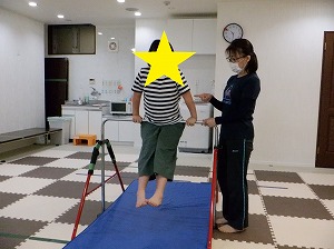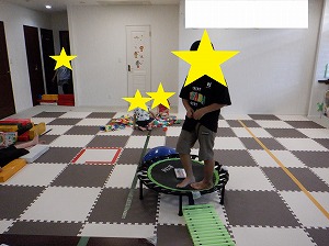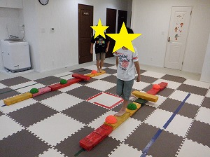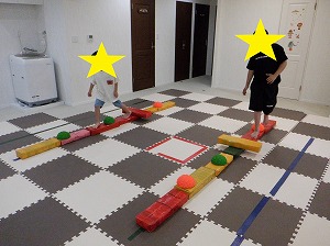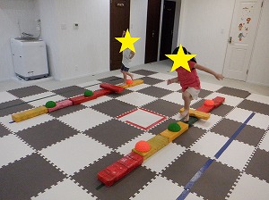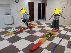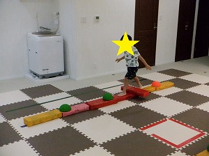 平均台に乗っている小さな山や障害物を踏まないように進んでみましょう!