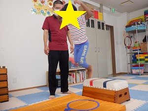 フープめがけてジャンプでは、跳び箱から両足で大ジャンプに成功です(*^^*)