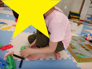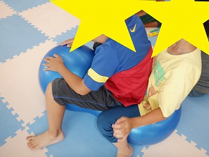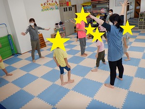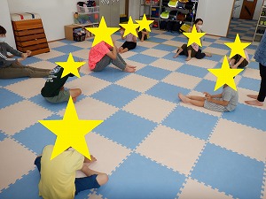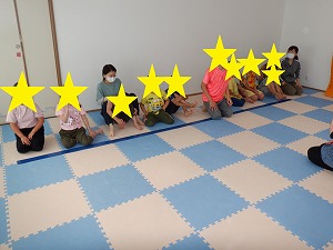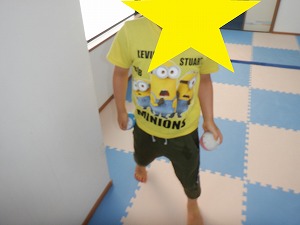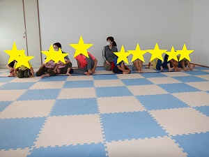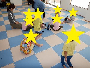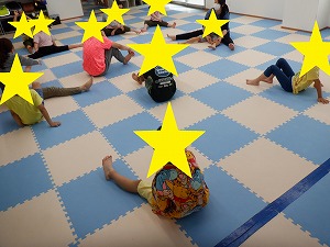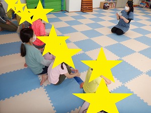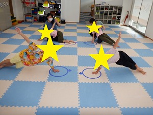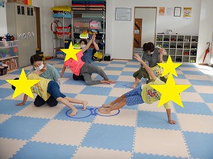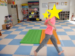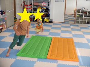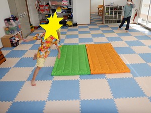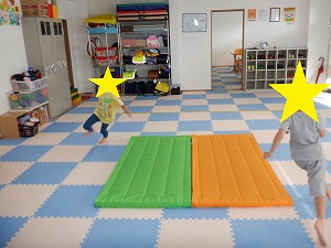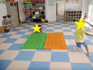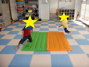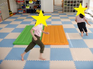 床に置かれた2枚のマットの周りを走ります。2~3人で走るので前のお友達を抜いたり、ぶつからないように走ります。