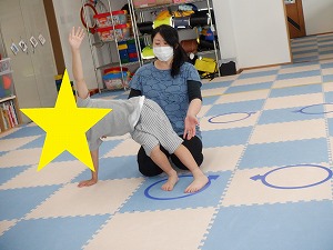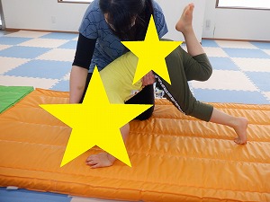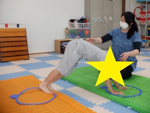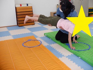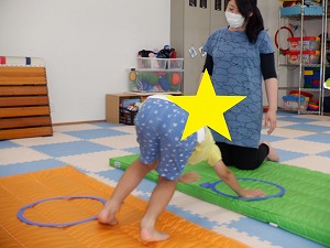 クマの忍者修行は2枚のマットを並べます。片方のマットのフープの中に両手を置き、足を高く上げて隣に置かれたマットのフープに足を着地させます。