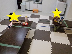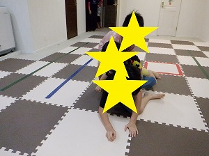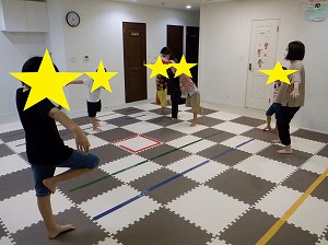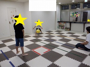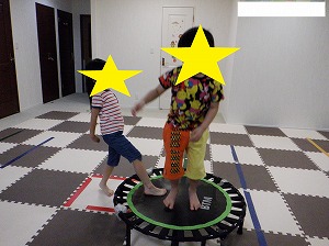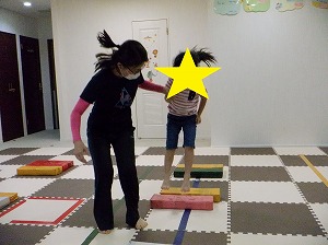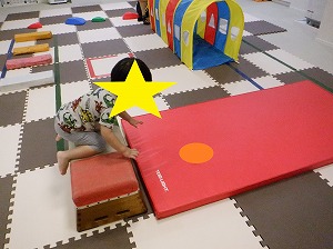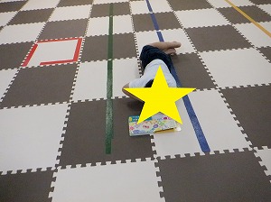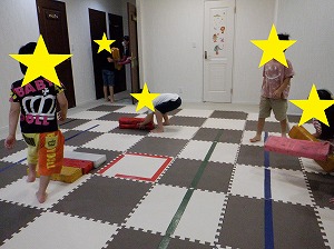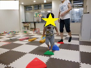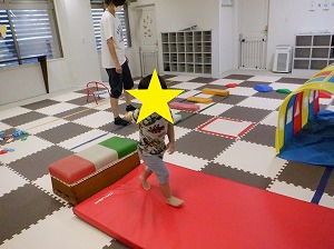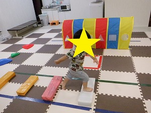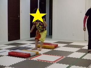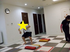 平均台を3個並べた所を両足を揃えてジャンプしてみましょう!