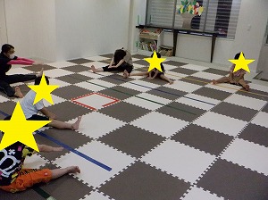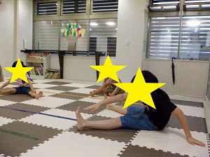 柔軟は、膝を伸ばして自分の足先を触ります。