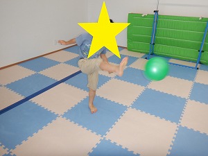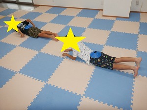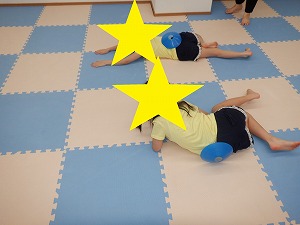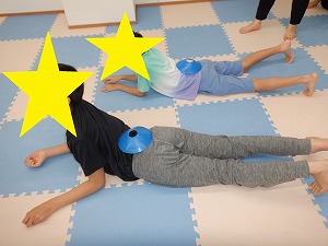 足を使わないワニさん歩きで背中にカップをのせて腕の力だけで進みます。