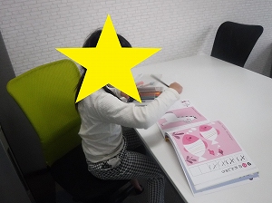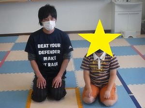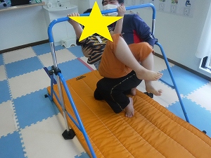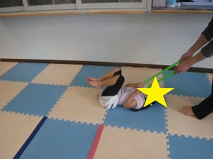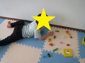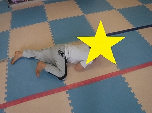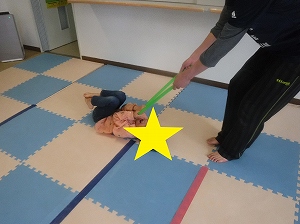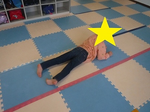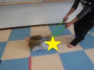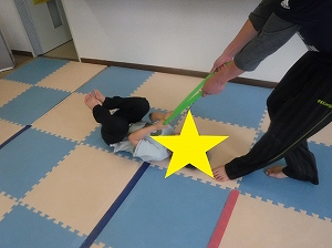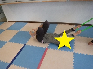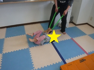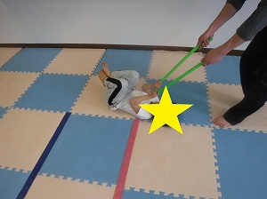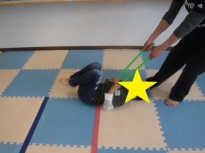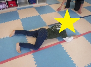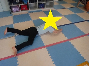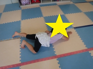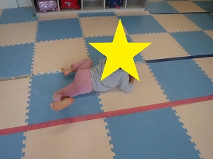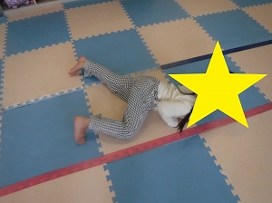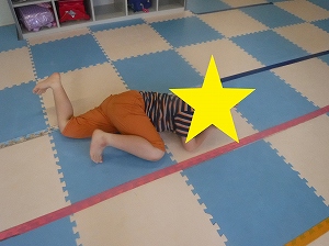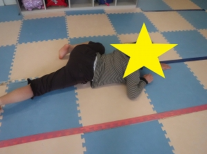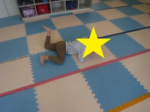 お腹を床につけて這うように進みます。手をパーにすること、ほふく前進にならないように意識します!
