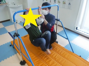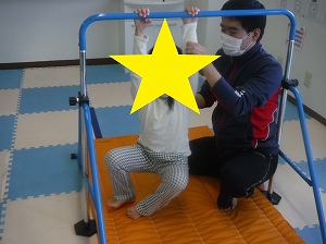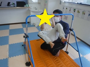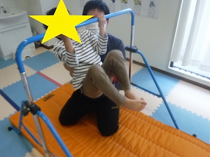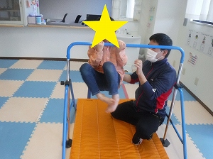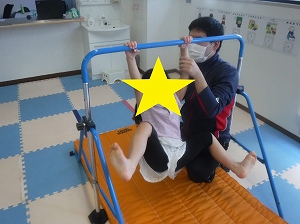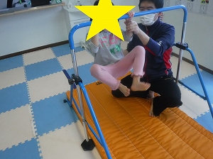 鉄棒にぶら下がって足の裏同士をパンパン!と叩きます。