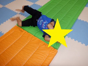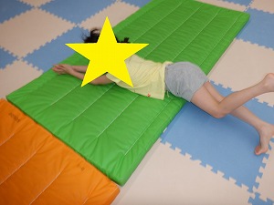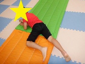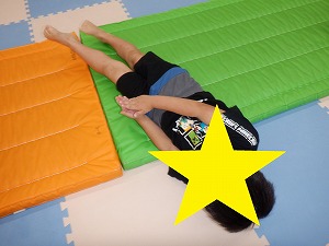回転は、指先を見るようにすると目が回りにくくなります。体がぶれずにまっすぐ横に転がることが大切です。