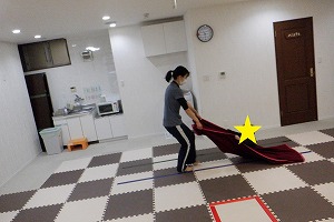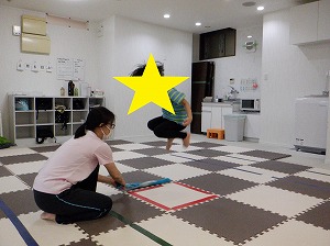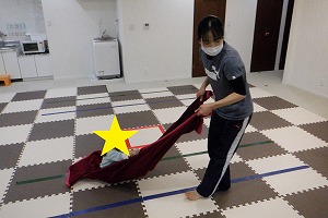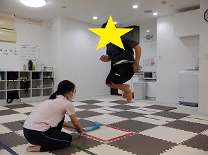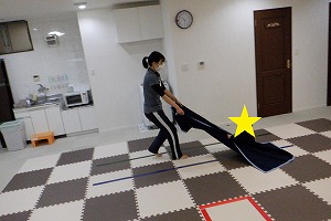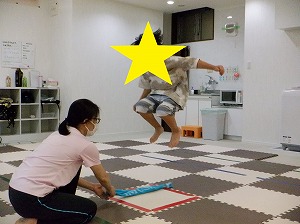 赤い枠の中から出ないように回転するタオルを跳びます。