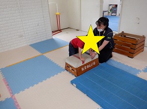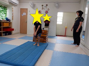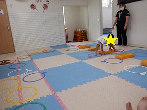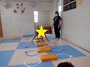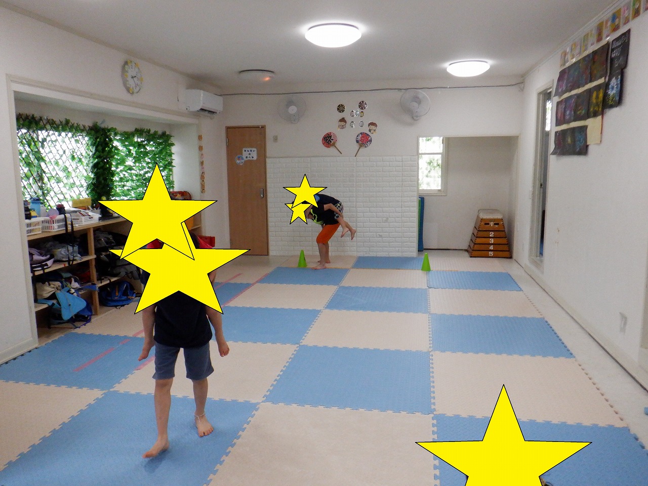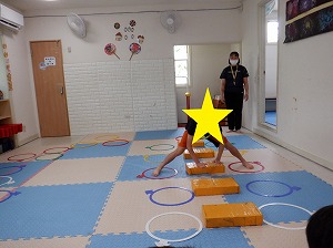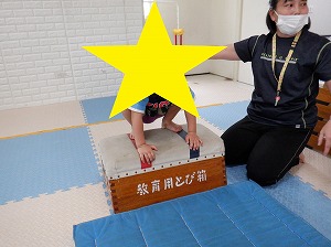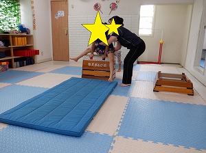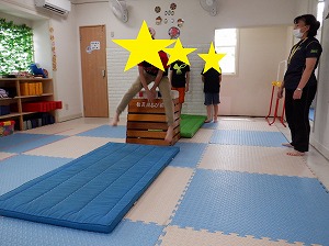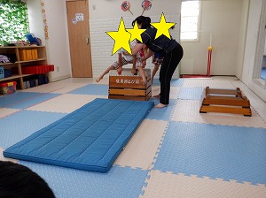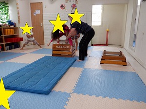 跳び箱が跳べるお友だちは、跳び箱の両側にマットをひいて、跳んだ後にすぐに、後ろを向いて跳び箱を跳ぶ練習をしました!!