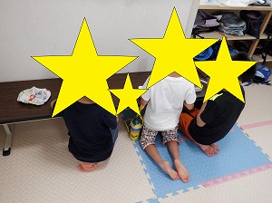 先生の話を聞いて、お兄さんたちが、小さい子の面倒を見て