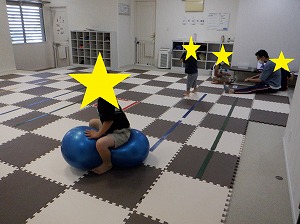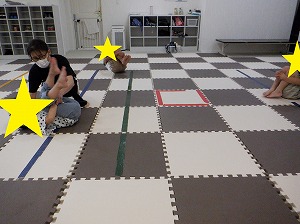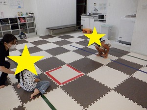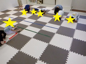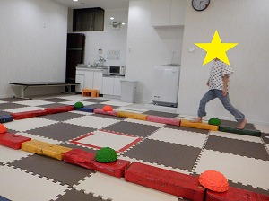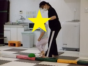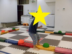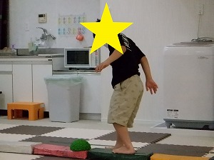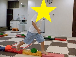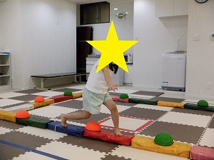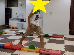 平均台の上に置いたカメの甲羅やコーンを踏まないように歩きます。