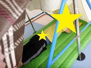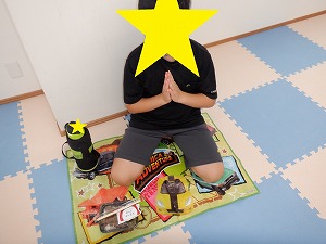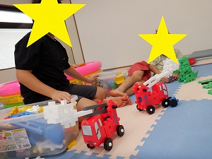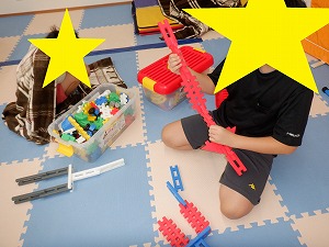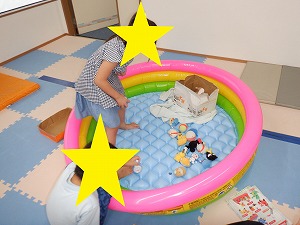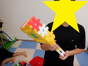 自由遊びでは、ニューブロックで武器を作ったり、プールで横になってのんびり過ごしたり、カルタをしたり色々な遊びで遊びました。