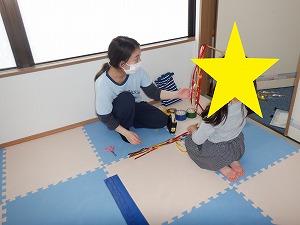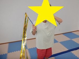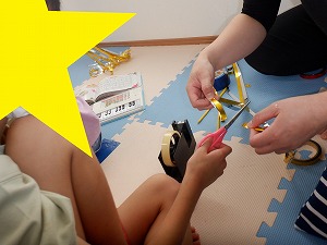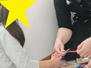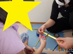 工作では魔法の杖作りもしました。リボンをハサミで切りテープで止めてます。