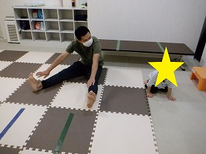 柔軟体操はひざが曲がらないように注意してやりましょう。