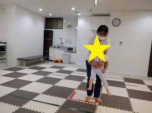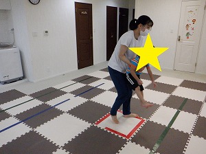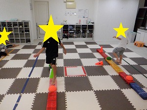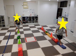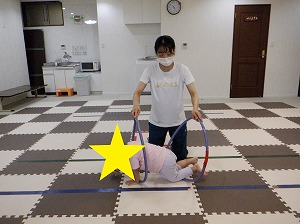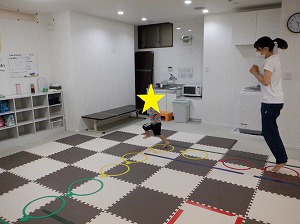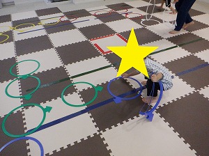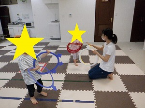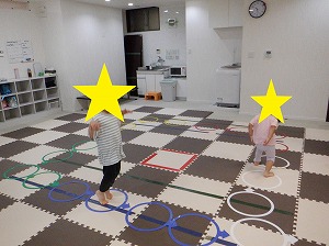 フープで作ったコースを両足を揃えてジャンプで渡りましょう!