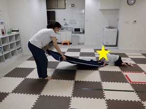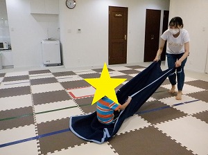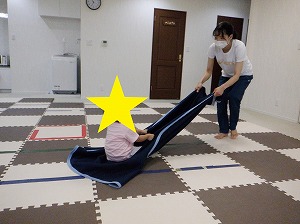 毛布の上に座って先生に引っ張ってもらいます。