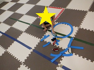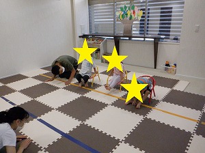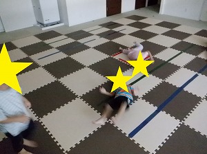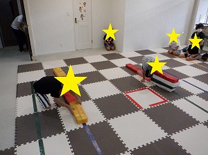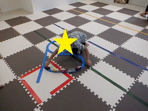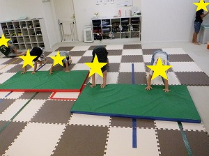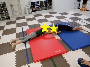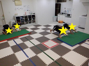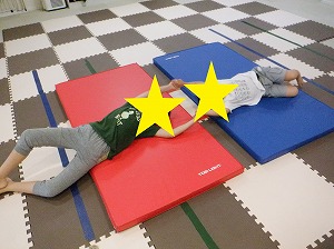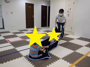 お友だちと力を合わせて、マットを押しながら進みます。