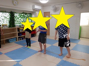 リーダーから「前・前・後ろ」など、出された指示を覚えて3本のロープの間をジャンプで移動します。