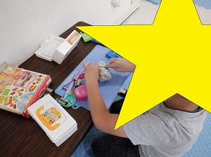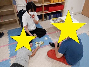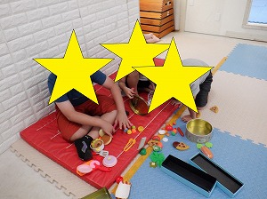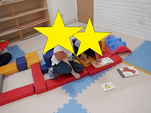 今日は、粘土、平均台を使ってソファ作り、ジェンガ、UNO、ままごと、本読み・・・。