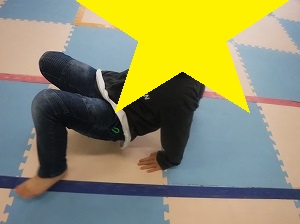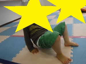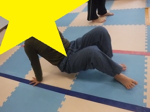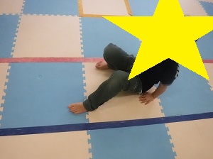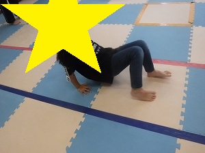 おへそを上にして手足を床につけます。お尻をあげて進みます。