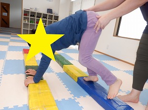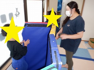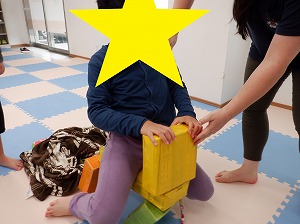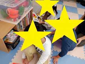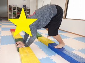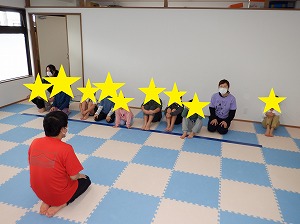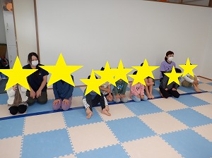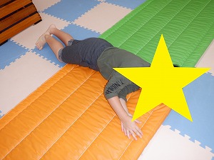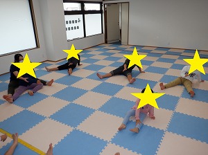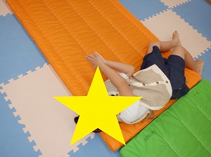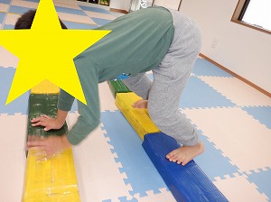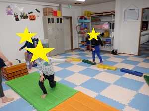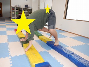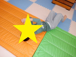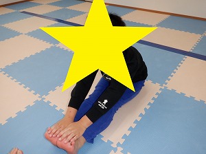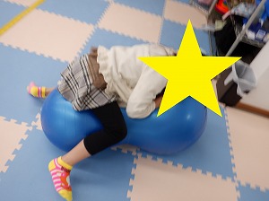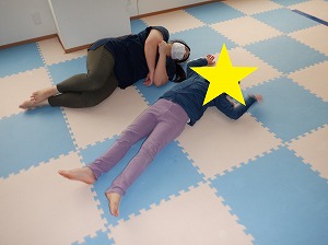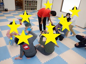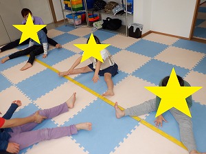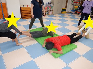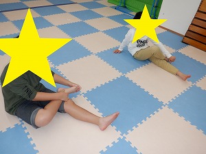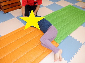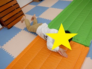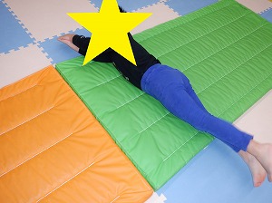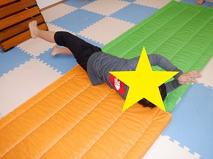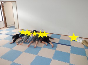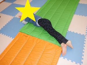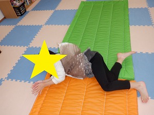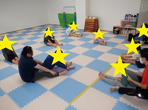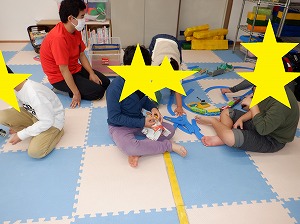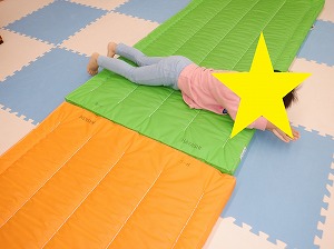 サツマイモゴロゴロは自分の頭の上に組んでいる手を見ながら回転すると真っ直ぐ回転する事が出来ます。マットから落ちないように気を付けて回転して頑張っていました☆