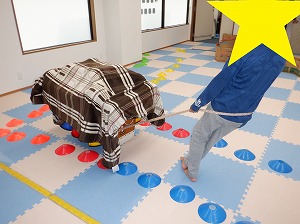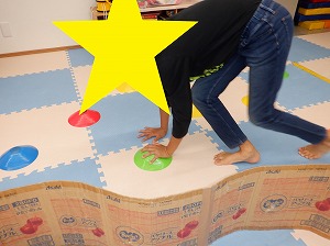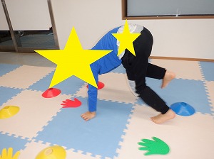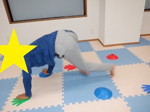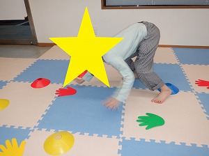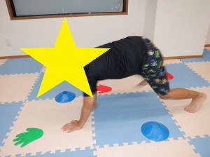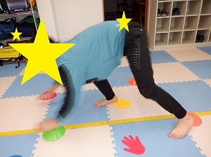 クマさん歩きで指定された色のカップや手のマーカーにタッチをしながらお散歩をします。
