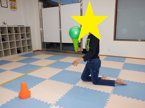 ペンギン歩きでコーンの上に乗せたボールを落とさないように運びます❣