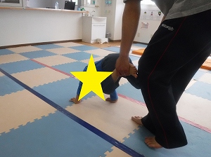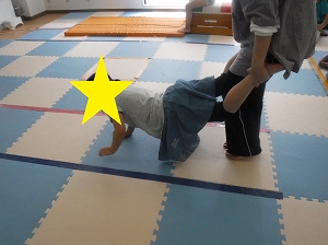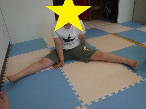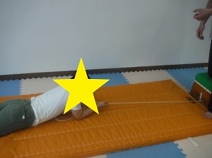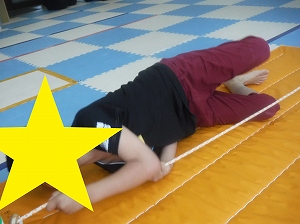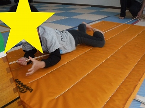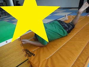 うつ伏せになって、後ろ手で足首を持ち、顔を上げ反り返ります(*_*)