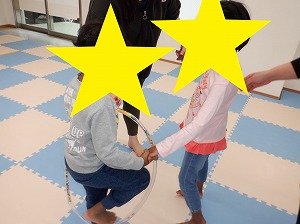 みんなで手を繋ぎフープを右から左へと渡していきます。